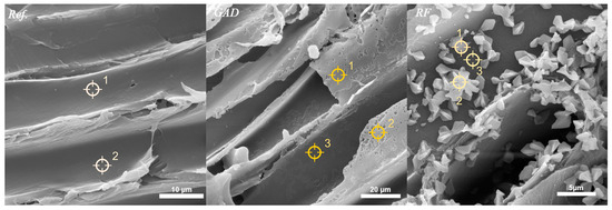 After RF treatment, pyramidal particles appeared in the green circle of RF-8K in Figure 3, with particle sizes ranging from 2 to 2.5 μm. Such large particles cannot be products of oxidation reactions under the plasma treatment conditions in this study but are rather fragments caused by the impact of active particles from the plasma. Additionally, RF treatment caused cracks on the wood surface, as shown by the area in the red circle of RF-1K in Figure 3. The RF-treated sapele, shown in Figure S5, also exhibited widespread spherical and cubic particles. These phenomena are examples of RF’s “physical etching” of poplar. This is related to the emission mechanism of RF. Active particles generated in a low-pressure environment have a longer mean free path due to high vacuum, allowing greater acceleration and kinetic energy. According to the literature, RF electron temperatures typically range from 3 to 5 eV [45,46,47]. Such high-energy particles cause mechanical damage to the wood interface upon impact. Therefore, RF’s effect on wood is more related to physical etching, whereas GAD primarily changes the chemical environment of the wood interface through oxidation reactions. RF modification also involves oxidation reactions, with the adhesion of particles being oxidation products, too; the relevant evidence is discussed in detail in the subsequent EDS spectral section.