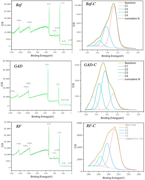 Figure 5 shows the XPS characterization of poplar samples, and Table 4 provides the peak fitting data from XPS analysis. From the full spectrum of XPS, it can be seen that the oxygen content on the surface of poplar significantly increased after plasma treatment compared to untreated samples. The O/C ratio reversed, with carbon three times the oxygen in untreated poplar, while RF treatment increased oxygen by 30%, and GAD treatment increased it by 110%. This indicates that GAD induces oxidation reactions more effectively than RF. The XPS data align with the trends in the oxygen/carbon ratio observed in the preceding EDS analysis. The SEM, EDS, and XPS results collectively point to the fact that plasma treatment increases the proportion of oxygen-containing groups on the surface, with the extent of the increase varying depending on the type of wood and plasma. Similar conclusions have been drawn by Talviste, Novák, Král, and others, and these findings are corroborated by many researchers [13,15,39].