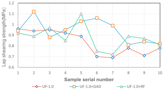 Table 5 presents the contact angles and absorption characteristics of plasma-modified wood for UF adhesive. Figure 6 shows the shear strength data from 10 bonding experiments, where the bonding strength of plasma-treated poplar fluctuates around the average value of untreated poplar. Multiple experiments failed to conclude that bonding strength was consistently improved. The reason can be that RF etching produces fragments and grooves, while GAD only peels off the surface layer, leading to inconsistent liquid absorption by the wood. After GAD treatment, the increase in highly polar C=O and O-C=O groups far exceeds that of RF-treated samples several times. Additionally, different surface groups have significantly varying bonding properties with adhesives. For example, it is well-recognized that epoxy and isocyanate adhesives easily form chemical bonds with R-OH groups, while urea–formaldehyde resin mainly forms hydrogen bonds with oxygen-containing groups. However, the bonding effect caused by hydrogen bonds is much weaker than that of chemical bonds [19,49,51]. The excellent modification effects did not translate into superior bonding characteristics, further illustrating that plasma modification is a comprehensive reflection of multiple property changes, and wood bonding performance cannot be linearly connected to modification effects. Differences in modification results can affect adhesive properties to varying degrees, resulting in significant variations in bonding effects for plasma-treated wood. Therefore, it is extremely simplistic to conclude that plasma can enhance wood bonding based solely on its surface modification effects.
