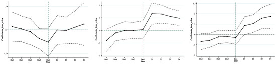 The parallel trend test is a prerequisite for conducting staggered DID estimation, ensuring that the change trends of the explanatory variables in both the treatment and control groups remain consistent prior to policy intervention. We employed Beck et al.’s [65] research findings to perform the parallel trend test. Due to the extensive time span covered by our data, to preserve all samples, we present the parallel trend chart only depicting the initial five and final four phases of policy intervention after the tail reduction (Figure 2). Figure 2 reveals that the regression coefficient of the signed FTAs between China and other countries for current and previous years is statistically insignificant, validating the parallel trend hypothesis.