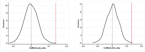 The staggered DID method requires confirmation that the policy shock is random. If the FTA signing is not random, the policy assessment may be biased; therefore, we next performed a placebo test on models (2) and (3) in Table 8. This study references Ferrara et al.’s [67] and Liu and Lu’s [68] method to determine whether other unobserved factors drive the influence of FTAs on China’s forest wood product trade. We applied randomization to the time points and China FTA member states, and performed 1000 Monte Carlo simulations. Figure 3 shows the estimated coefficient distribution of the resulting policy impact. The vertical dotted red line indicates the estimated coefficient of the real policy impact, confirming that the distribution of the kernel density estimates of the total trade, export, and import volume of the explanatory variables are all around zero. Therefore, the FTA signings meet the principle of random distribution, and other unobservable factors do not appear to drive the impact of FTAs on China’s forest wood product trade.