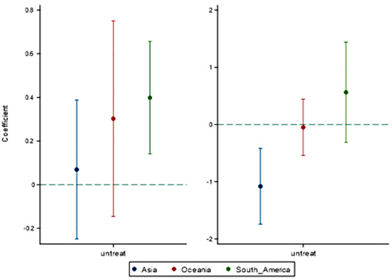 To further investigate the trade diversion effect resulting from FTA signing, we adopted Wang’s [58] approach, creating a variable untreatjt. Specifically, if China signed an FTA with a certain country, the variable untreatjt takes on a value of one for non-FTA member countries that are closest to this FTA member country; otherwise, it takes on a value of zero. (In the empirical analysis, we selected three continents that have signed FTAs with China, namely, Asia, Oceania, and South America, and specific countries from these continents that are relatively close to FTA member countries. Specifically, Japan and India were chosen from Asia, Papua New Guinea and Solomon Islands were chosen from Oceania, and Brazil and Uruguay were chosen from South America.) By estimating the coefficient α1, we measured the trade diversion effects resulting from FTAs. The specific model is formulated as follows: