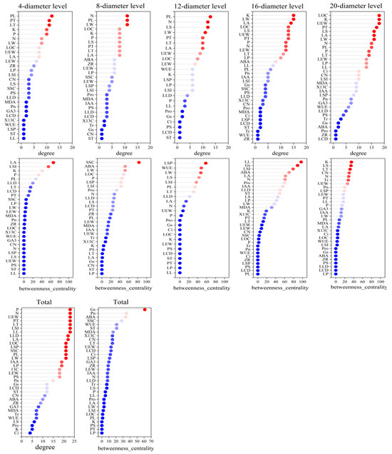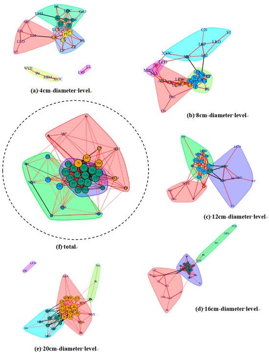 The comparison of the nodal parameters of the LTN at different developmental stages and during the overall development of P. euphratica revealed (Figure 4) that the trait with the highest network structure neutrality at the 4 cm diameter level was petiole length, and the leaf area had a high median; at the 8 cm diameter level, the traits with the highest neutrality were petiole length, leaf width, and leaf total nitrogen, and the trait with the high median was leaf soluble sugar; at the 12 cm diameter level, the trait with the highest neutrality was petiole length, and the trait with the highest median was leaf soluble proteins; the traits with the highest median in the 16 cm diameter class were leaf width and leaf total potassium content, and the trait with the highest median value was leaf length; the traits with the highest median values in the 20 cm diameter class were the leaf total potassium content, leaf organic carbon content, and thickness of the upper epidermal cells of the leaf, and the trait with the highest median value was the leaf total potassium content. These results indicate that the leaf trait networks of P. euphratica at the five different developmental stages exhibited different functions.