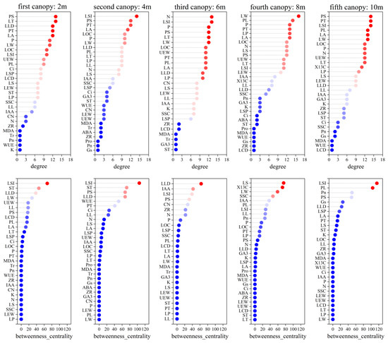 A comparison of the nodal parameters of the leaf trait network in different canopy layers of P. euphratica revealed that the highest degree of network structure in the 2 m canopy layer was the fenestrated tissue ratio, and the leaf shape index had the highest median value; in the 4 m canopy layer, the leaf shape index had the highest degree and median value; in the 6 m canopy layer, the traits with the highest degrees were nitrogen content and leaf shape index, and the highest median trait was leaf laxity; in the 8 m canopy layer, the trait with the highest degree was leaf width, and that with the highest median valley was leaf starch content; finally, in the 10 m canopy layer, the traits with the highest degree were the leaf shape index, fence ratio, and tissue thickness, and that with the highest median value was leaf shape index. The highest moderate trait in the fourth canopy was leaf width, and that with the highest median value was leaf starch content. The highest moderate traits in the fifth canopy were the leaf shape index, fenestrated tissue ratio, and fenestration tissue thickness, and the trait with the highest median value was leaf shape index. These results suggest that the network of foliar traits in the five different canopy layers of P. euphratica exhibited different highly adaptive strategies (Figure 7).