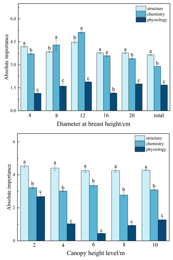 Comparison of the relative importance of structural, chemical, and physiological traits in P. euphratica leaves at different developmental stages and canopy heights. Note: Different letters indicate significant differences (p < 0.05), and the error line indicates the standard error. The total developmental stage is meant to be a sample of 60 trees at all developmental stages.
