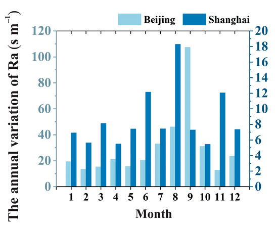 Annual variation in aerodynamic drag (Ra, s m⁻1) in Beijing and Shanghai.