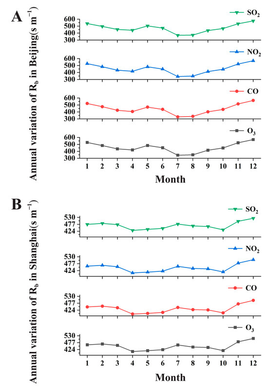 Annual variation in boundary-layer-transport resistance (Rb, s m−1) of the gas pollutants O3, CO, NO2, and SO2 in (A) Beijing and (B) Shanghai.