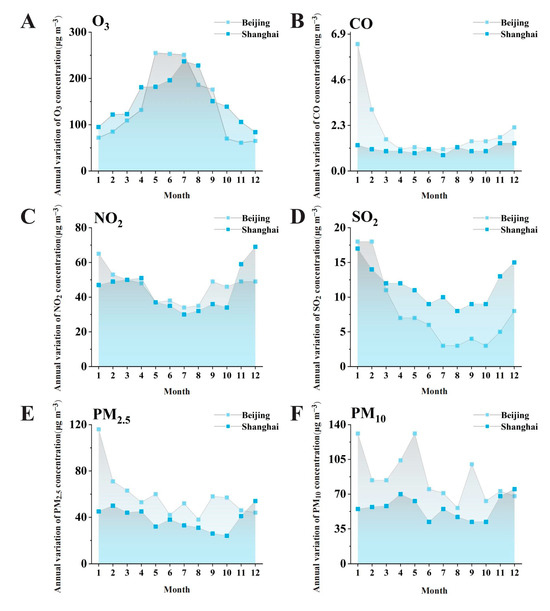 Annual variation in (A) O3, (B) CO, (C) NO2, (D) SO2, (E) PM2.5, (F) PM10 concentration in two cities.