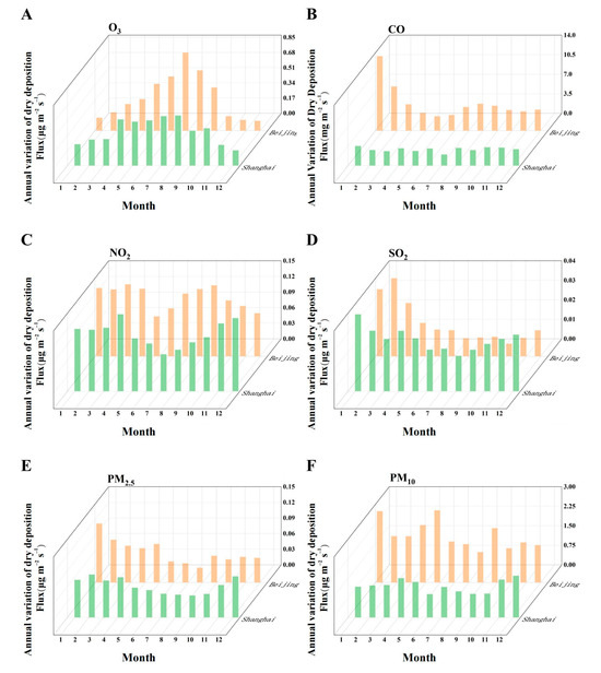 Figure 8 illustrates that the dry-deposition flux of pollutants is influenced by both pollutant concentration and dry-deposition velocity. This study examined pollutant concentrations in Beijing and Shanghai; these concentrations influence the dry-deposition flux of pollutants. Both cities display similar annual variations in O3 concentrations, with higher levels in summer and lower levels in winter. However, Beijing has significantly higher O3 concentrations than Shanghai. In Beijing, the average summer O3 concentration is approximately 200 μg/m3, while the winter average is around 95 μg/m3. In Shanghai, the average summer O3 concentration is around 215 μg/m3, and the winter average is about 98 μg/m3.
