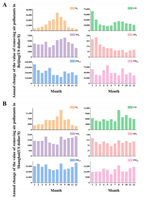 Dry deposition of gaseous pollutants primarily occurs during the daytime since plant stomata close at night, reducing its efficiency. In contrast, particulate matter (PM2.5 and PM10) is removed through vegetation interception day and night throughout the year. Shanghai has the highest Vdg for PM2.5 (1.6 × 10−6 s m−1), followed by Beijing. Shanghai’s PM2.5 Vdg is relatively high in late winter, spring, and autumn and lower in summer. In Beijing, PM2.5 Vdg is higher in winter and spring and lower in summer and autumn. The Vdg trends for PM10 and PM2.5 are similar, with PM10 generally having a higher Vdg value by approximately 0.02 m s−1. This is due to the Vg value being set to 0 for PM2.5 and 0.02 for PM10 in the simulation calculations. Shanghai has the highest annual average Vdg for PM10 (2.15 × 10−5 s m−1), followed by Beijing (2.09 × 10−5 s m−1). Shanghai’s PM10 Vdg is relatively high in late winter, spring, and autumn and lower in summer. In Beijing, PM10 Vdg is higher in winter and spring and lower in summer and autumn.