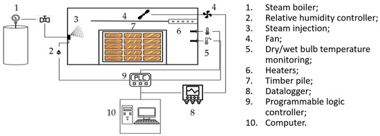 The experiments were conducted in a dry kiln with a capacity of 0.78 m3 that was capable of attaining temperatures of up to 90 °C and maintaining an air velocity of 4 m s−1. Steam was utilized for humidification, while electric resistance provided heating. Each experiment involved around 120 sawn pieces, including control samples. Psychrometric conditions were continuously monitored, with dry/wet bulb temperatures recorded using J-type thermocouples. Air velocity was regulated using a frequency converter and checked every five minutes with an anemometer. All data were stored using a data acquisition system (Data-Logger). Figure 2 shows a schematic of the kiln components.