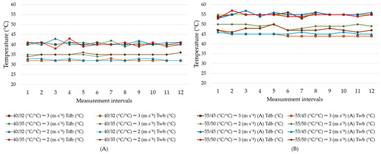 Dry and wet bulb temperatures measured during the experiments at dry bulb temperatures of 40 °C (A) and 55 °C (B).
