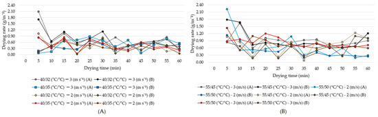 Drying rate during each treatment at dry bulb temperatures of 40 °C (A) and 55 °C (B).