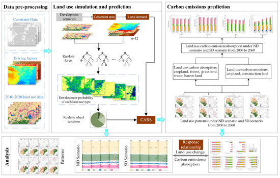 The 2023 report of the United Nations Intergovernmental Panel on Climate Change (IPCC) showed that the global surface temperature was 1.1 °C higher in 2011–2020 compared with 1850–1900 [1,2,3]. Climate change is a global problem faced by all human beings, and it is urgent to reduce greenhouse gas emissions and curb global warming. China committed in 2020 to achieve carbon peaking by 2030 and carbon neutrality by 2060. Previous studies showed that land use carbon emissions had become one of the major sources of greenhouse gas emissions, which directly affected the regional carbon cycle system and changed the level of regional carbon emissions [2,4,5]. Therefore, the study of future land use change and its impact on carbon emission is of great value for improving land use efficiency, rationally adjusting the land use structure, and realizing the goal of the dual-carbon strategy.