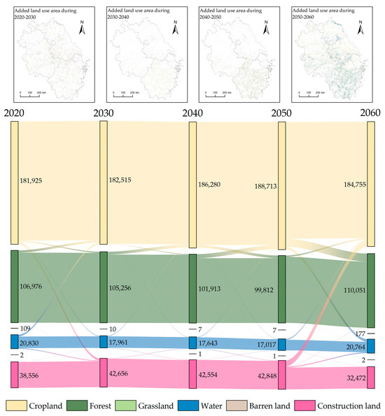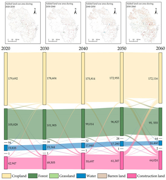 The transfer trajectories of various land use types under the two development scenarios during 2020–2060 are shown in Figure 3 and Figure 4. Under the ND scenario, cropland and construction land were mainly transferred to each other, which was mainly subject to constraint mechanisms such as linking new construction land with illegally occupied cropland. Under the SD scenario, cropland and forest were mainly transferred to each other, which was subject to the regulation of the “in-and-out balance” cropland protection system with the area changes of the two land use types being relatively smooth. In addition, the total outflow area of construction land during the period 2050–2060 was predicted to be 10,376 km2, which was mainly changed to cropland with an outflow area of 8922 km2 (accounting for 86.8%). This is probably due to China’s increasingly intensive land use policies and the measures encouraging the reclamation of construction land into cropland, especially in rural areas. The effectiveness of these policies and measures is expected to be significantly improved in the long-term process of urbanization and the anticipation of continued population decline in the future. However, the interconversions of grassland, water, and barren land rarely occurred under both scenarios.