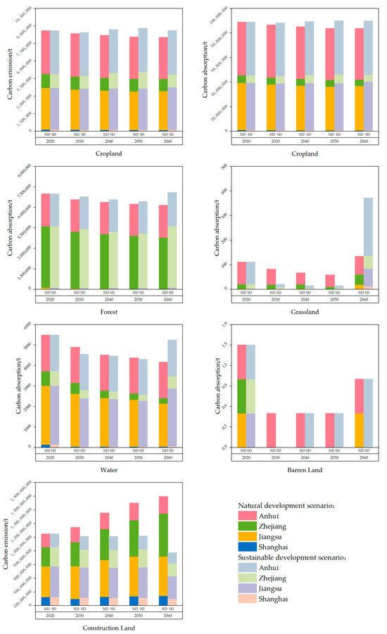 Carbon emission/absorption of each land use under the two development scenarios during the period 2020–2060 are shown in Figure 6. The simulated cropland area under the SD scenario was larger than that under the ND scenario for each epoch, leading to both higher carbon emission and higher carbon absorption of cropland under the SD scenario. The total carbon absorption of cropland was larger than the total carbon emission of cropland under both development scenarios, resulting in the larger net carbon absorption of cropland under the SD scenario compared with that under the ND scenario. According to the National Plan for Sustainable Agricultural Development (2015–2030), the YRDR belongs to the optimized development area, of which Anhui and Jiangsu provinces are important agricultural provinces in China. The average net carbon absorption of cropland in Anhui and Jiangsu provinces accounted for 50.2% and 43.2% of the total net carbon absorption of cropland in the YRDR during 2020–2060 under the ND scenario, while the average total net carbon absorption of cropland accounted for 49.5% and 43.5% of the total net carbon absorption of cropland in the YRDR during 2020–2060 under the SD scenario, respectively. The average net carbon absorption of forests in Zhejiang and Anhui provinces accounted for 63.3% and 35.1% of the total net carbon absorption of forests in the YRDR during 2020–2060 under the SD scenario, respectively.