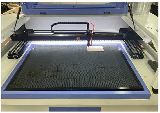 The CO2 laser cutting machine (Jinan Baomei Numerical Control Technology Co., Ltd., Jinan, China) used in this experiment is shown in Figure 2; its wavelength was 10.6 µm, the rated power was 80 W, the maximum processing speed was 200 mm/s, the spot diameter was 0.1 mm, the pulse width was 20 ns, the pulse repetition frequency ranged from 1 kHz to 10 kHz, and the lens focal length was 63.5 mm. The influence of wood moisture content, density, and other factors in the laser absorption rate of wood was considered during gas-assisted laser processing. Cherry wood veneer was selected as the test substrate; the specifications were 120 mm × 80 mm × 2.5 mm (length × width × thickness), and the moisture content was 11%. Industrial helium with purity ≥ 99.999% was selected as the auxiliary gas. An Apreo scanning electron microscope (SEM) produced by Thermo Scientific (Waltham, MA, USA) was used to observe the microstructure of the slit surface resulting from gas-assisted laser processing. The landing energy of the SEM ranged from 20 eV to 30 keV, the bias voltage of the sample stage ranged from −4000 V to +600 V, the xy-axis travel range of the sample stage was 110 mm × 110 mm, and the tilt was within a range of −15° to +90°.