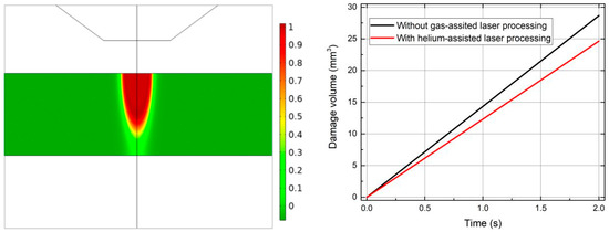Equation (10) shows that temperature was the main factor in determining the damage speed. During the wood laser ablation process, the damage was irreversible, and the damage level range was between 0 and 1. A value of 0 indicated no damage, and a value of 1 indicated the limit beyond which further destruction was not possible. If the value of was equal to 1, then 1 − would be equal to 0, indicating that the damage range had reached its maximum and would no longer change with increasing temperatures. If the value of was between 0 and 1, it implied that the wood could continue to be damaged with increasing time or temperatures.