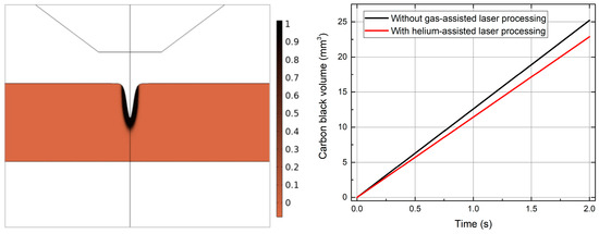 A carbon black volume comparison during laser processing with or without gas assistance is shown in Figure 4. The residual carbon black volume refers to the formation of a carbonization layer on the slit surface during wood laser ablation. The residual carbon black volume generated without gas-assisted laser processing was greater than that generated with helium-assisted laser processing. Due to the expanded heat-affected zone caused by heat transfer during the wood-burning process, many carbides adhered to the slit surface, resulting in a larger residual carbon black volume. Helium-assisted laser processing fundamentally prevented heat release through oxygen disconnection and flame-retardant mechanisms. Meanwhile, due to the cooling and purging effect of airflow, the temperature on the slit surface decreased, the heat-affected zone expansion was inhibited, and the residual carbon black volume decreased.