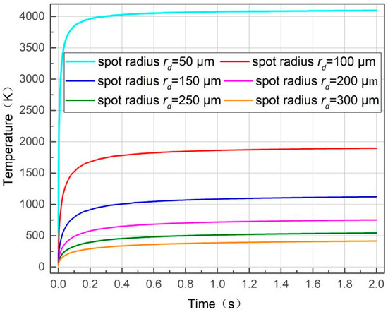 Temperature field changes with different spot radii are shown in Figure 5. The spot radius significantly affected the temperature field distribution within the wood. For all spot radii, the temperature growth curve always first increased and then saturated. This could be due to energy accumulation during laser processing, where absorbed energy continuously increases over time, leading to a rapid temperature rise. When the wood completed gasification and ablation reactions under high-temperature irradiation, the ablation damage at the incision reached its maximum, and there was no excess material for heat conduction; at this time, the temperature field was in a stable state. A longitudinal point in time was evaluated; when t = 1 s, the maximum temperature showed a decreasing trend with an increased spot radius during an identical irradiation time. This could be because the total power remained constant: the larger the spot radius, the larger the irradiation area, and the smaller the surface power density. Therefore, less heat was absorbed per unit area on the wood surface, decreasing the temperature value. The spacing between adjacent curves was not equal; because the laser irradiation area was proportional to , the temperature field decreased exponentially with an increased spot radius during gas-assisted laser processing.
