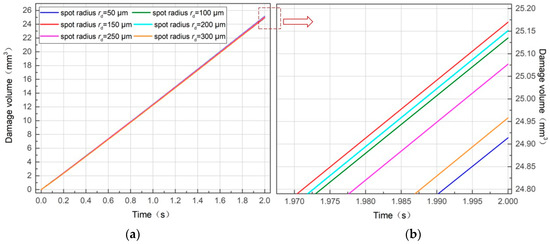 Change curve of wood ablative damage volume with different spot radii (rd). (a) The general trend of the curve change. (b) The detail values of curve at t = 2 s.