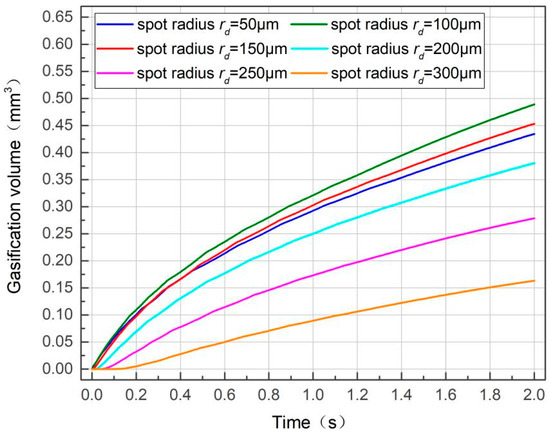 Gasification volume changes with different spot radii are shown in Figure 7. The gasification volume diverged with time in a fan pattern under different spot radii. Due to the transition from the solid phase to the gas phase during the gasification process, the non-linear change caused by the heat absorption of this phase transition resulted in a partial cross-interval during the growth of the gasification volume over time. A transverse comparison of any given spot radius shows that when rd = 200 μm, the increased gasification volume at t = 2 s was significantly greater than at t = 0.2 s; with the accumulation of ablation time, the more laser energy acting on the wood surface, the larger the gasification volume produced. A longitudinal time point was evaluated; when the action time was t = 1 s, the gasification volume was about 0.434 mm3 for rd = 50 μm, about 0.453 mm3 for rd = 150 μm, and about 0.163 mm3 for rd = 300 μm. The gasification volume changed irregularly with an increased spot radius because it was related to the surface area of the laser-irradiated wood and the heat conduction depth. Because the total power of the laser irradiation remained constant, when the spot radius increased, its corresponding action area increased; at the same time, the heat conduction depth decreased owing to heat divergence. Conversely, when the spot radius was small, the corresponding action area was relatively small, but the heat conduction depth increased owing to heat concentration. Therefore, when the same laser energy irradiated the wood, only the appropriate spot radius was selected; thus, the maximum wood gasification volume could be obtained in the cutting process.