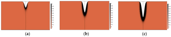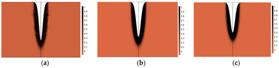 Laser power is a crucial parameter in laser processing equipment and significantly influences slit depth, slit width, and cutting quality. Variations in laser power affect heat energy density, directly affecting the temperature field distribution. To investigate the influence of different laser powers on temperature field distribution during gas-assisted laser processing for wood, Scheme c in Table 1 was selected for parameter design, and the temperature field change rule during this process was simulated.