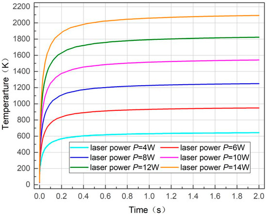 Temperature field distribution changes with different laser powers are shown in Figure 9. Laser power significantly influenced the temperature field, and the center point of the laser action on the wood surface was the highest temperature in the entire cutting area. For all laser powers, the temperature growth curve consistently first increased and then saturated. At the initial laser action stage, heat distribution became more concentrated with time, the energy absorbed by the wood increased continuously, and the temperature rose rapidly. With a prolonged action time, the heat partially dissipated from the system owing to the convection heat transfer caused by auxiliary gas sprayed from the nozzle. Simultaneously, with increased temperature, the surface radiation effect became more prominent, and the whole system partially lost energy owing to the radiation effect. Eventually, when the energy loss caused by radiation and convective heat transfer balanced with the total laser power, the temperature of the entire system reached a stable state and no longer changed with time. A longitudinal time point was evaluated; when the action time was t = 0.6 s, the increased temperature was approximately proportional to the increased laser power, and the intercept between the curves at identical times was the same. This was because laser energy was the primary heat source during wood ablation; in the same period, a higher laser power resulted in higher heat source temperature; thus, the slit temperature increased with the increased heat acting on the wood surface.
