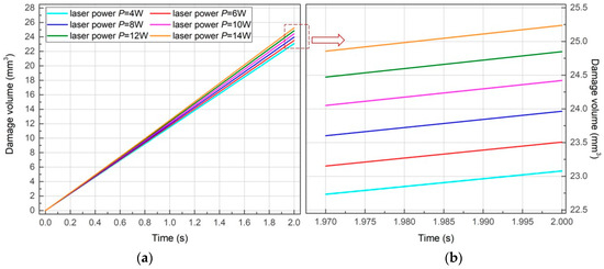 Ablative damage volume changes with different laser powers are shown in Figure 10. The damage volume changed with time in a radial pattern under different laser powers, and the divergence became more pronounced. When t = 0, there was no laser energy irradiation; no ablative reaction occurred as the starting point for ablative damage, which did not effectively reflect the influence of laser power on wood damage volume. A transverse comparison of any given laser power shows that the increased damage volume under laser action at t = 0.2 s was significantly smaller than at t = 2 s; the longer the ablation time, the greater total energy accumulation and the larger the difference in damage volume. A longitudinal time point was evaluated; when the action time was t = 1 s, the damage volume was approximately 11.53 mm3 at P = 4 W and about 12.47 mm3 at P = 14 W. Thus, the damage volume increased with the increased laser power at the same time. The difference in the vertical intercept between the adjacent curves was basically the same, showing that the damage volume changed linearly with increased unit power.