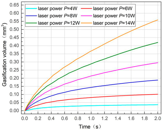 Gasification volume changes with different laser powers are shown in Figure 11. The ablative gasification volume changed with time in a fan-divergent under different laser powers. A transverse comparison of any given laser power shows that when the laser power was P = 4 W, the gasification volume remained constant during t = 2 s of laser irradiation. This was because the energy acting on the wood surface was low; in addition to the energy absorbed by the wood surface, the heat conduction to the interior of the slit could not reach the gasification temperature of the wood; thus, the gasification volume was relatively small. When the laser power was P = 14 W, the gasification volume increased rapidly with the ablation time because the initial energy acting on the wood surface was high enough to reach its gasification temperature; therefore, the longer the ablation time, the more total energy accumulation and the greater the gasification volume produced. A longitudinal time point was evaluated; when the action time was t = 1 s, the gasification volume was approximately 0.03 mm3 for P = 4 W and about 0.37 mm3 for P = 14 W. Thus, the gasification volume increased with increased laser power at the same time. The difference in the vertical intercept between the adjacent curves increased multiple times, and the gasification volume changed linearly with the increased unit power. During gas-assisted laser processing, the irradiation energy acting on the wood surface gradually increased, the gasification volume of wood changed significantly, and the wood surface and internal areas that achieved gasification increased; thus, the gasification volume increased.