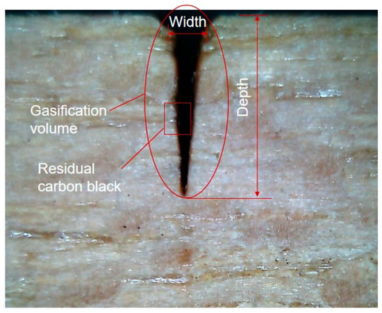 Residual carbon black changes with different laser powers are shown in Figure 12. When the wood was irradiated by a high-energy laser beam to reach its boiling point and directly gasify, the heat was transferred to the surrounding low-temperature region through a thermal conductivity mechanism. Wood primarily consists of compounds containing carbon (C), hydrogen (H), and oxygen (O); thus, during the heat transfer process, when the temperature drop could not reach the wood gasification condition, combustion occurred at high temperatures, and a carbonization influence zone was generated around the slit. The residual carbon black volume was related to the size of the gasification volume; the larger the laser power and the longer the thermal action time, the greater the residual carbon black volume.