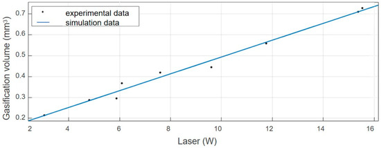 A comparison between the experimental and simulation data for gasification volume is shown in Figure 14. The distance between the laser nozzle and the wood surface, h, was 1 mm; gas pressure, Pgas, was 0.1 MPa; and the spot radius, rd, was 250 μm. Experimental measurements of the gasification volume value increased with increased laser power, and were distributed on both sides of the simulated predicted value. The experimental results were basically consistent with the simulation results. The experimental data were fitted and analyzed with the simulation data; the mean square error, R2, was 0.9860; the root mean square error (RMSE) value was 0.0233; and the error term degree of freedom was 7. Furthermore, the predicted value significantly exceeded the critical test value, and the model adjustment determination coefficient was 0.9840. These results demonstrate that the model exhibited excellent fitting performance with minimal testing errors, effectively describing the influence of relevant parameters on the processing quality of gas-assisted laser processing for wood. The data analysis results from the simulation model were highly reliable.