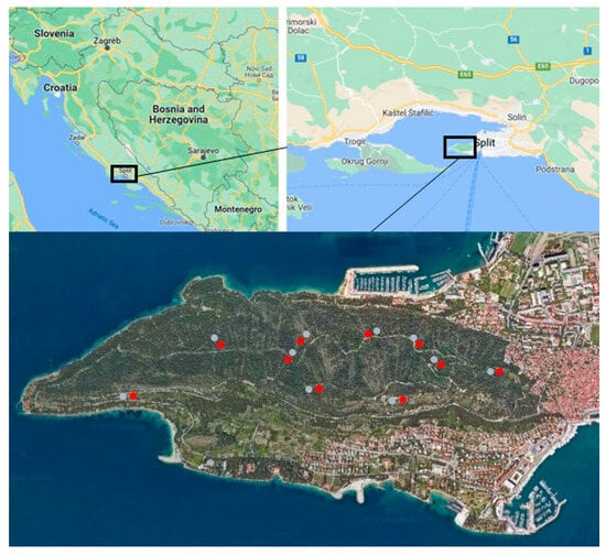 This study was carried out between 2020 and 2022 in the public forest (forest park) of Marjan, close to the city of Split, in a 200 ha Allepo pine stand. Marjan is a hill peninsula that was declared a forest park in 1976 and is located just a couple of hundred meters from Diocletian’s palace, which is in the center of Split. It is of great importance to the citizens of Split as a recreational area and historical site. The whole protected area of Marjan is ca. 300 ha in size, with forest making up approximately two-thirds of it. Throughout history, it was covered with holm oak and manna ash forest (Fraxino orni, Quercetum ilicis) that has gradually degraded. Today, it is mostly dominated by Aleppo pine. Geographically, Marjan is a peninsula, surrounded by the sea and connected to the mainland by a narrow strip on which the city of Split continues. Because the influence of the bark beetles’ arrival from the outside is almost negligible, this field experiment could be considered an open-air laboratory experiment.