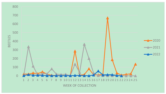 MPEs caught in pheromone traps between 2020 and 2022 were compared with previous years [18]; the catches were constantly decreasing, indicating a population decline. Additionally, the catches between 2020 and 2022 show the collapse of the outbreak very clearly (Figure 3).