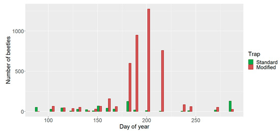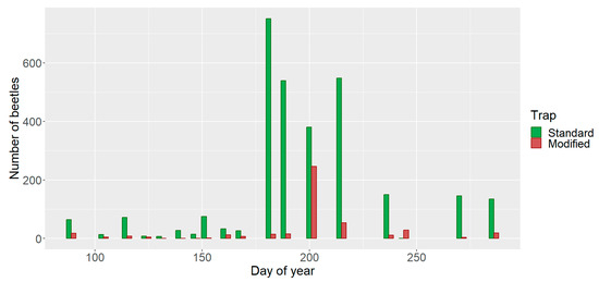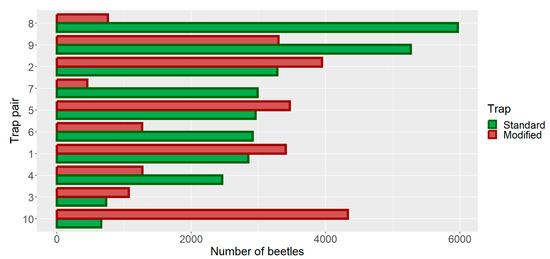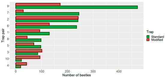 Although the pairs of standard and modified traps were placed close to each other and under similar conditions, the number of beetles captured was different (Figure 4). The average number of beetles captured in the standard traps was statistically greater than the average number of beetles captured in the modified traps (permutation paired t-test, p = 0.03).