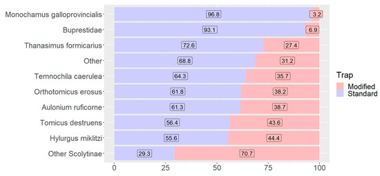 According to our observations, the efficiency of the modified traps was about 25% lower than that of the standard traps. We can see that fewer beetles of each species, except for Scolytinae, were caught in the modified traps than in the standard traps (Figure 7).