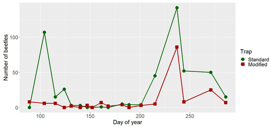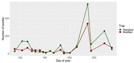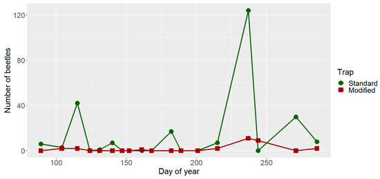 Number of beetles caught in standard and modified traps during the entire 2022 season.