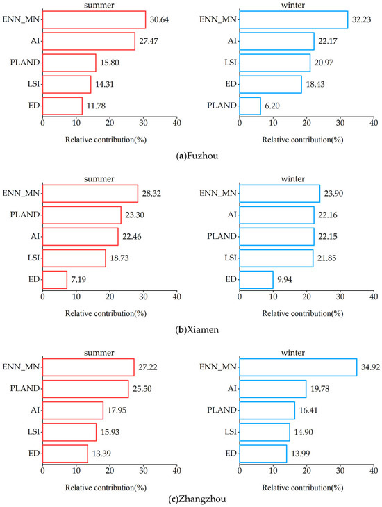 3.3. The Relative Contributions of Urban Forest Landscape Pattern Indices to Seasonal LSTs in the Three Cities