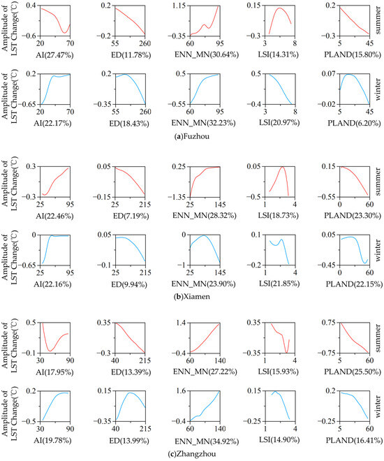 3.4. The Marginal Effects of Urban Forest Landscape Pattern Indices on Seasonal LSTs in the Three Cities