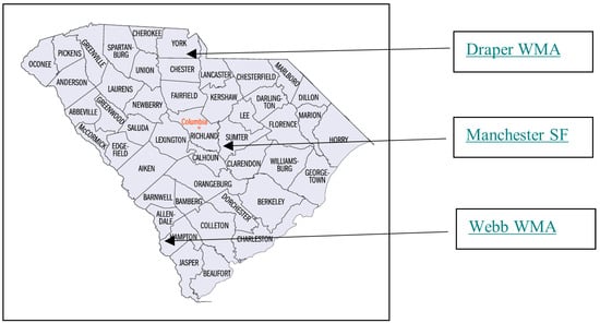 Site one was located on Draper Wildlife Management Area (South Carolina Department of Natural Resources property) in York County (34°51′30″ N/81°11′15″ W). The site, located in the Piedmont physiographic region, lies within a minor floodplain of Love Creek consisting of Chewacla loam (0%–2% slope; frequently flooded; somewhat poorly drained). Site two is situated in Manchester State Forest (South Carolina Forestry Commission property) in Sumter County (33°49′00″ N/80°35′25″ W). The site, located in the upper coastal plain region, exists in the Wateree River swamp containing Tawcaw–Duckbottom–Mullers complex soils (silty clay loam (Tawcaw) or clay (Duckbottom and Mullers); 0%–2%; frequently flooded; somewhat poorly or poorly drained). Site three was on Webb Wildlife Management Area (SCDNR land) in Hampton County (32°36′00″ N/81°22′37″ W). This site, located in the lower coastal plain region, is situated in the Savannah River swamp and has Tawcaw–Chastain complex soils (silty clay loam (Tawcaw) or loam (Chastain); 0%–2%; frequently flooded; somewhat poorly drained). All three soil types on the sites have site index values of 95 or greater (base age 50) for sweetgum.