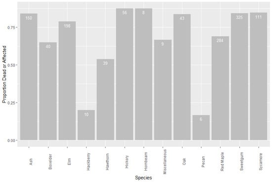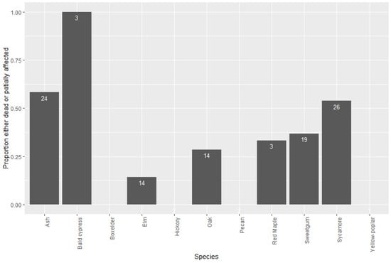 The proportion of leave trees affected by herbicide (either dead or partially affected) across all sites. The numbers inside the bars are the total number of trees sampled. Only two species, with a higher number of sampled trees, had more than 50% partially affected and dead trees. Boxelder and yellow-poplar had one individual, and hickory and pecan had two individuals and were not affected.
