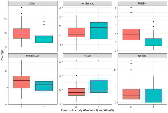Comparison of dead or partially affected (1) and alive (0) leave trees against different variables. Abbreviations: diameter of leave trees (LDiam), the number of treated trees around leave trees (NumTreated), mean diameter of adjacent treated trees (MADBH), average amount of herbicide used on the adjacent tree (MAHamount), and the number of hacked (NHack) or girdled (NGirdle) adjacent trees.
