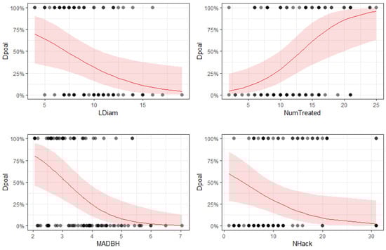 Predicted probability (red line) of leave trees being dead or partially affected by herbicide (Dpoal) against independent variables from the mixed effect logistic model. LDiam (diameter of the leave tree), MADBH (mean diameter of adjacent treated trees), NumTreated (number of treated trees both hacked and girdled), NHack (number of trees hack and squirt treated). Points in the figure are original data points showing dead or partially affected (1) and alive (0) trees.
