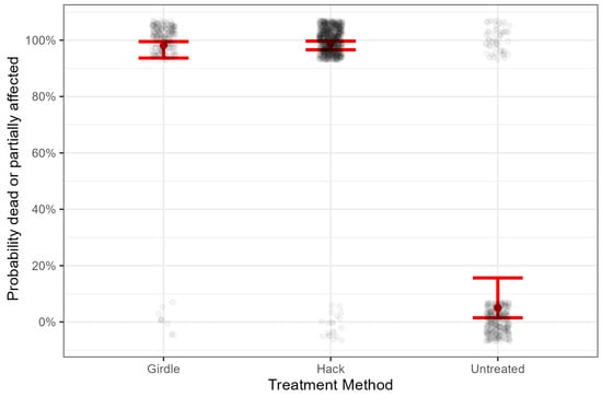 Predicted probability of treated trees being dead or partially affected by the herbicide application from the mixed effect logistic model plotted against treatment methods (girdle, hack and squirt, and untreated). Red dots and lines are the predicted probabilities with confidence intervals, and gray dots are the jittered raw data (alive = 0 and dead or partially affected = 1).