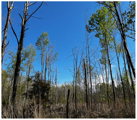Each study site was chemically thinned to attempt to create conditions similar to a shelterwood used for regeneration in mature stands. This practice left trees that were evenly distributed across each site to enable sunlight penetration while creating a semi-shaded environment on the forest floor. The initial goal was to maintain residual stands with basal areas of approximately 4.6 m2 and 9.19 m2 of basal area per hectare at each location. The tree/stems that were left standing (leave trees) were those considered to be codominant or better (i.e., trees with noticeably larger sized crowns). These stems did not receive any form of chemical application. Some leave trees originated from coppice regeneration. For multiple coppice stems, only one or two trees were deadened by ring girdling without herbicide added to rings. All residual stems were marked with florescent paint and measured for dbh. The surrounding targeted stems, less than 15.24 cm dbh (6 inches, which was the original unit of measurement), were treated by hack and squirt (cut stem treatment) with a 50% triclopyr acid (Trycera®) and 50% water solution. Larger diameter stems received a complete ring girdle (<2.5 cm depth) with approximately 1 milliliter of the herbicide solution for every 7.6 cm (3 inches) diameter increase (15.4 cm–22.6 cm (6.1–8.9 inches) trees = 3 milliliters, 23.1–30.2 cm = 4 milliliters, etc.). Herbicide treatments involved ring girdling in addition to cut stem treatments to necessitate deadening of the overstory. Ring girdling is needed to control larger diameter stems as basal bark and cut stem treatments are limited in effectiveness to smaller diameter stems (typically >15.2 cm (6 inches) diameter at breast height (dbh)). Single ring girdling with herbicides has been observed to be more effective compared to ring girdling without herbicides or double ring girdling [7], thus single ring girdles were applied in this study. Coppice regeneration, which has multiple stems, should incorporate mechanical girdling only and avoid herbicide use. The chemical application to one stem would likely result in damage to adjacent stems that share the same root system regardless of herbicide used. The amount of herbicide used to treat larger stems will increase however, which may contribute to flashback. This study relied on girdling to control a component of larger overstory trees. Chemical/girdling treatments were conducted across the three sites from June 2020–August 2020. Bottomland oak species were underplanted in late winter/early spring 2021 as the primary study emphasis. A subsequent study was put in place when the observation of chemical flashback in residual overstory trees became evident.