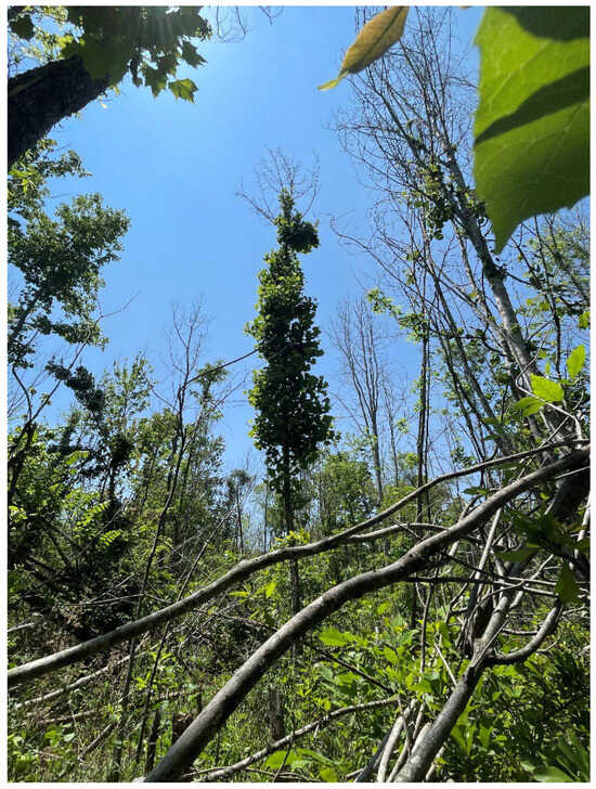 - Eck, W. Investigating Treatment Windows for Effective and Environmentally Sound Herbicide Applications for Controlling Tree-of-Heaven. Master’s Thesis, West Virginia University, Morgantown, WV, USA, 2005. Available online: https://researchrepository.wvu.edu/etd/4145 (accessed on 21 July 2024).