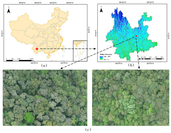 (a) Study area in China; (b) elevation and topography of Yunnan region; (c) images of mixed forests captured using UAVs.