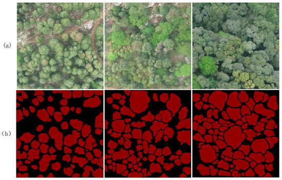Selected broadleaf forest images taken by UAV: (a) original image; (b) labeled image.