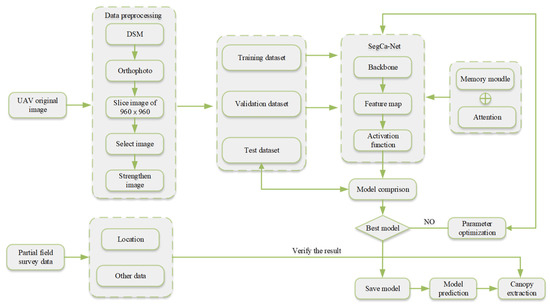 The tree crown segmentation algorithm includes five parts: data preprocessing, dataset allocation, network training, crown extraction, and accuracy evaluation. As shown in Figure 4, the orthorectified image is first cropped and processed, from which high-quality images are selected for labeling. A single-tree crown is extracted from the labeled images and fused into a pre-training dataset. Using the pre-trained model, the global mixed forest image is input into the SegcaNet network for training. The iteration with the optimal parameters is selected to examine the training accuracy and results. The overall workflow is shown in Figure 4.