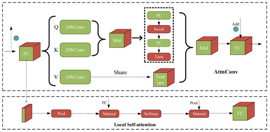 The classic Transformer generates Q, K, V vectors after linear transformations [38], and AttnConv adopts this same concept. As shown in Figure 7, the generated Q, K, V vectors share the weights of the depthwise separable convolution after the linear transformations. Q, K, V all utilize these shared weights to aggregate local information. The difference is that and , after aggregating local information, calculate the Hadamard product. The Hadamard product is then processed through a fully connected layer and an activation function to generate context-aware weights.